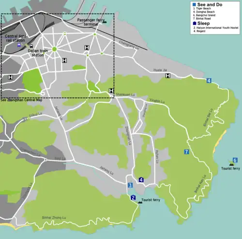 Zhongshan District (中山区; Zhōngshānqū), at the eastern edge of Dalian, encompasses the main business and commercial centre of Dalian and many of the most scenic parts of the southern coastline. As a result visitors to the city tend to spend most of their time here, a fact reflected in the wide range of hotels and restaurants found in the district. The downside of this popularity is that hotels, restaurants and shops tend to be more expensive than in other parts of the city. That being said for those who can afford it, or take advantage of the few lower budget options available, Zhongshan District makes for an excellent base for exploring Dalian.