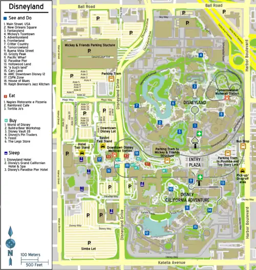 The Disneyland Resort is bounded by Katella Avenue to the south, Ball Road to the north, Walnut Street to the west, Harbor Boulevard to the east, and the Santa Ana Freeway (I-5) on the northeast corner. Disneyland Drive runs through The Disneyland Resort. The Anaheim Convention Center is located south of the resort across Katella Avenue.