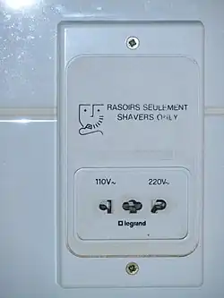 Hotels often provide a special electrical outlet specifically for electric shavers. They allow any voltage shaver to be plugged into them and be used safely in front of the bathroom mirror. They may also accept your cellphone adapter or similar low power battery charging unit. Many electric shavers sold today are dual voltage 50/60 Hz and some will even recharge the battery at 12V DC (such as in an automobile). Check the label and instructions for compatibility.