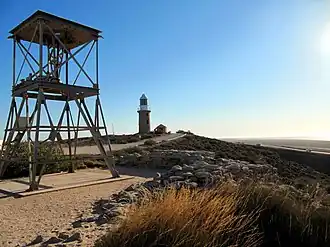 - π Vlamingh Head Lighthouse was completed in 1912 and de-activated in 1969 when a light was fitted to one of the naval radio towers. It's a popular place to watch the sun set over the ocean (which you can't do in Exmouth, where the sun sets behind the hills) - and indeed the sun rise, as it's one of the few places on the continent with an ocean view both ways. On top of the hill is the remains of a radar dish installed for Operation Potshot in 1942, and destroyed by a cyclone in 1945. The bay is a popular diving spot.