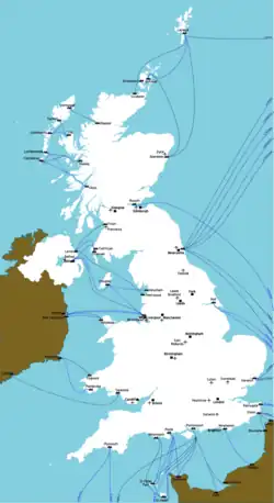 As Britain is an island, ferries were the only way to get into the country prior to the advent of aviation and later the construction of the Channel Tunnel which gave a "dry foot" route from Britain to the continent for the first time since the Ice Ages. See also the Get in section of the United Kingdom article. Below is a list of routes that cross the North Sea, English Channel or Irish Sea. It may not be complete.
