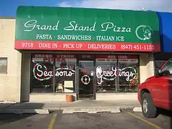 - Grand Stand Pizza, 9718 Grand Ave. It was voted the best thin crust pizza by Fox Chicago in 2005, and it shows. Ordering a slice is good, but it's the whole pizzas that will win over your taste buds.