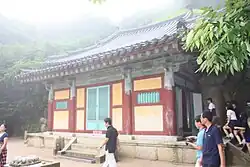 - 🌍 Girimsa Temple (기림사) (about 10 km east from the center; take the bus from the city center to Andongsamgeo-ri, and then walk or take a taxi for the remaining 4 km). At the foot of Hamwolsan mountain, this temple was founded in 643 in the twelfth year of the rule of King Seondeok. The relatively large compound comprises of 16 buildings. The main highlights are the three floor pagoda (Samcheung Seoktap), the Daejeokgwangjeon hall and the golden sitting Buddha statue of Geonchilbosal Jwasang. This temple is much quieter than the one in nearby Bulguksa.