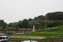 Forested hills dominate the region; between them there are rice fields as well as houses and roads. Downtown Gyeongju is a small city without high-rises. These, on the other hand, can be found some 5km to the east, namely "Bomunhu Resorts", a collection of several expensive hotels next to an eponymous lake. In the 2012 census, there were some 264,000 inhabitants in the city. The region is famous for the traditional roofs on the houses; even some gas stations have them.