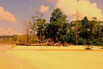 Radhanagar Beach in the late afternoon🌍Elephant Beach(A path to the beach starts from the road to Radhanagar; look for a dip in the road on a curve where there will usually be a few motorbikes parked. Several paths head off from this point, ask around for the correct one. If you choose to trek alone through the forest then stick to broad path since there are forks along the way. The walk is about 30 minutes at an easy pace with dry weather.).* Elephant Beach is further north from Radhanagar and is popular with Indian tourists. The shoreline here was largely swept away by the 2004 tsunami and the beach is a fraction of what it used to be; however, the coral here is probably the best on the island, making this an excellent spot for snorkeling. It's reachable on foot from Beach #7 or by fishing boat from the east side of the island; many resorts arrange snorkeling and diving trips here. Since the tsunami, the path ends in an expanse of uninviting looking swampy water. Rather than attempting to go around, wade straight through it — the beach is only 100 meters straight ahead, the water is rarely above knee-height and the ground is solid. As you enter the swamp, you would see a small red board ahead, to your left; bear towards it. Wear sandals when crossing to avoid sharp shells. During high tide, water may be a foot deeper in last 6 metres or so. While snorkeling, keep an eye out for the glass-bottom boats. If trek and get to the beach and are tired to trek back an option would be to take a boat ride from there to jetty, normally they charge ₹100 per person, only challenge is finding someone who is willing to take you and then take an Auto ride for ₹100 again to the point where the vehicle is parked.(updated Mar 2015)