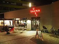 - 🌍 Uusi Sauna, Välimerenkatu 10. Tu-Sa 16:00-00:00, closed Su M. A stylish and spacious public sauna and bar in Jätkäsaari. Separate saunas for men and women. You can bring your own towel or rent one from the bar. The bar has a diverse selection of drinks and you can bring your drink to the dressing room (not to the actual sauna though). The bar has live music playing on special event nights. Sauna €18, beer around €10.