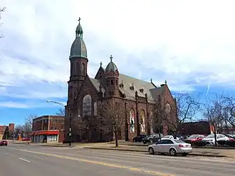 Continue eastward down Stanislaus Street (or, if you parked in the church lot, exit right onto Kosciuszko Street then turn left on Stanislaus). Turn left at Lathrop Street then right onto Sycamore Street, passing under the Belt Line Railroad and out of old Polonia. Four blocks past the railroad overpass, you'll find the next stop on our tour. A great vantage point to see this church is from in front of the striking midcentury-style Providence Funeral Home on Sycamore; if you don't want to park on-street, there's a fenced lot behind the building.