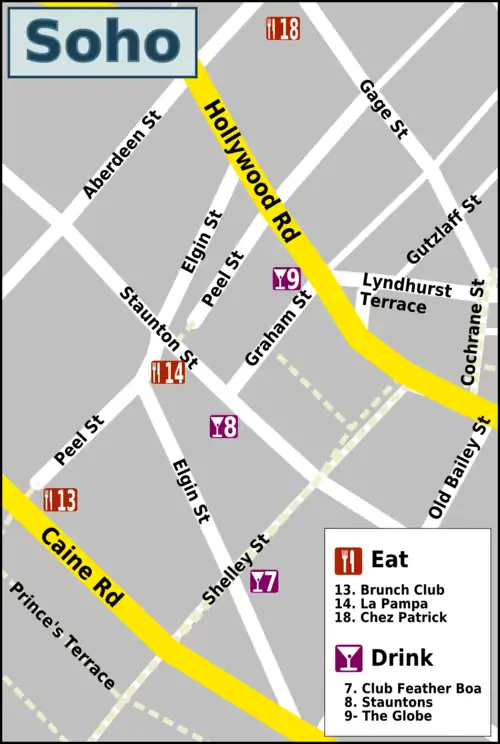 • SoHo (蘇豪 or 荷南美食區) entertainment zone between Hollywood Road and Bonham Road-Caine Road, featuring restaurants, bars, clubs, galleries and shops. Take the elevated walkway from the IFC mall to catch the escalator up. Short for South of Hollywood Road, and a reference to its namesake in London