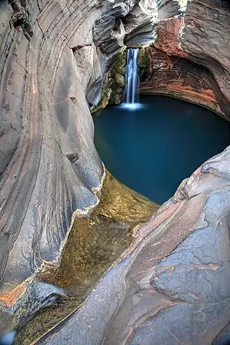 - ๐ Joffre Falls (1 km southeast of the Eco Retreat on Weano Rd; can be reached by a trail from there. However the easier approach is via Banjima and Joffre roads to the lookout and car park on the other bank). A walk takes you down into the "slot canyon", looking just about wide enough to drop a coin in, until it broadens out at the pool in "the amphitheatre". This trail is 1.5 km or 2 hours and involves some scrambling and clinging onto the rock face.