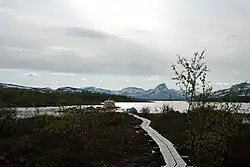 Trail with duckboards through fell birch forest in Malla nature reserve. - 🌍 Malla nature reserve with the 🌍 Three Border Point (Kolmen valtakunnan rajapyykki in Finnish, Treriksröset in Swedish, Treriksrøysa in Norwegian), where the national borders of Finland, Sweden and Norway collide. The tripoint is located in Golddaluokta, 10–20 km from Kilpisjärvi. It is reachable by boat and a 3 km hike or by a longer hike through the nature reserve. At the lake Kuohkimajärvi (Sámi: Guohkkemašjávri). This is a real national border, remember to carry necessary ID documents with you! Half a kilometer from the border point there is the 🌍 Kuohkimajärvi open wilderness hut (6 persons), a separate reservation hut, and a campfire site. Camping is allowed next to the Kuohkimajärvi hut. Note that you are inside a strict nature reserve; deviating from the marked trails (except in winter), causing erosion, picking berries or mushrooms, camping (elsewhere than by the hut), and disturbing wildlife is forbidden. Pets must be in leash all the time.