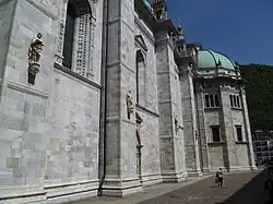 The Duomo di Como, that stands on the left side, is Lombardy's third largest religious building after the Cathedral of Milan and the Certosa of Pavia. Construction works began in 1396 and ended in 1744. The facade is dominated by the statues of the two Plinis, both born in Roman time Como. It is something unique to find two pagan figures in such a central position on a religious building. At the time of the Counter Reformation, the bishop of Vercelli Giovanni Francesco Bonomi, during his apostolic visit in Como proposed the removal of the two statues, works of the masters Tommaso and Giacomo Rodari, and dated 1480, but he had to desist in front of the strong opposition of the population.