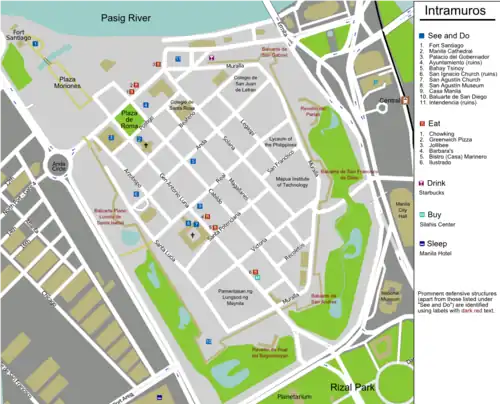 - 🌍 Fort Santiago, Santa Clara (on the NW end of Plaza Moriones), ☏ +63 2 527-1572. 8AM-6PM daily. The former military headquarters of the Spanish colonial government. Although the fort sustained very heavy damage during the 1945 Battle of Manila, several key portions of the compound were subsequently restored - including its iconic gate with a wooden relief featuring Santiago Matamoros (St. James the Moor-slayer), the patron saint of Spain. It is now considered a major landmark and one of Manila's most popular tourist attractions, partly because José Rizal - the national hero of the Philippines - was imprisoned here prior to his execution on 30 Dec 1896. The Rizal Shrine (see Museums, below), a small museum dedicated to his life and work, is housed in a restored section of one of the fort's former barracks. ₱75, ₱50 students/children.