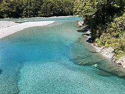 - 🌍 Gates of Haast, Haast Pass Hwy (OpenStreetMap directions). Although the Gates of Haast specifically refers to a gorge at the southern crossing where SH6 crosses the Haast River, it's known for its bridge put together with its idyllic background (no parking available).