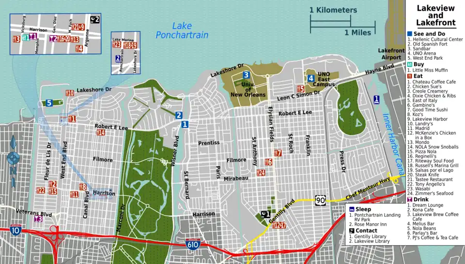 Lakeview and Lakeshore are sections of New Orleans near and along Lake Pontchartrain. The old neighborhoods along the riverfront, like the French Quarter and Uptown are most popular with visitors. The Lakeview and Lakeshore area are comparatively little visited by out of towners. It is known by locals for the parks along the lakeshore and restaurants.