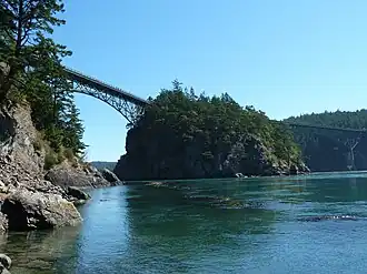At the north end of the island is the beautiful π Deception Pass State Park, with beaches, freshwater lakes and trails. Stop at the parking lot just before the Deception Pass Bridge, and stroll across the bridge's walkway. This bridge was built by the Civilian Conservation Corps during the Great Depression. Look down into the water; if the tide is flowing, you may see the standing waves, large whirlpools, and roiling eddies that make this passage treacherous for sailors.