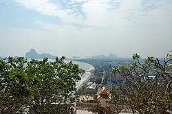 - 🌍 Khao Lom Muak, เขาล้อมหมวก กองบิน 5 ต.เกาะหลัก อ.เมือง จ.ประจวบคีรีขันธ์ (in the air base right next to the city), wing5rtaf@gmail.com. A 902-feet hill overlooking both Prachuap Khiri Kan and Ao Manao. The trail is only open during long weekends and between 5:30 AM - 9:00 AM (everyone needs to come down from the summit before noon). The trail is fairly steep, with a walk of around 1.7 km with an altitude gain of around 270 m; some parts require climbing, especially near the end. There are shops at the bottom that sell food, drink and souvenirs. No reservations are necessary. 40 baht per person.