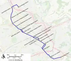 ION Light rail (route 301) serves major destinations, such as Downtown Kitchener, Uptown Waterloo, Conestoga and Fairway malls (northern and southern termini for ION light rail) and the two universities. This is the primary public transit service for visitors traveling within the twin cities of Kitchener and Waterloo. The ION light rail line has 19 stations along the route; however, four stations in Downtown Kitchener and two in Uptown Waterloo serve only one direction each as in these areas the line splits by direction to run along separate parallel streets. ION trains run at least every 10 minutes weekdays during the day, and every 15 minutes evenings, weekends and holidays.