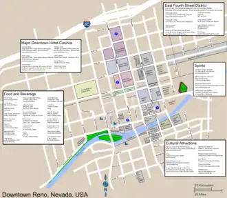 - The "Riverwalk" area. The North end of Reno's Riverwalk District meanders along Reno 's beautiful Truckee River. Most of the retail activity on this end is situated along First Street between Lake St. (east) and Arlington St. (west). This end of the district has galleries, coffee shops, great dining including a brewery and a French restaurant and even a movie theater. Reno 's renowned Truckee River Whitewater Park runs directly through this area offering visitors even more adventurous outdoor activities in the urban setting of downtown Reno. Kayak and raft rentals from Tahoe Whitewater Tours (☏ +1-800-442-7238) are available at Wingfield Park at the 1st and Arlington Street area.