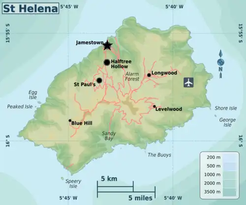 Jamestown is the capital and main town of Saint Helena. It is located in a narrow valley between steep 500-ft (150-m) cliffs which mean that it is quite a struggle to climb out of this V-shaped slot onto the surrounding plateau by any of the three access paths. All visitors to Saint Helena arrive at "The Wharf" in Jamestown. There is pretty much only a single road about one mile (1.6 km) long.