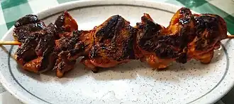 - Tapas are served in bars everywhere, with a string along Van Dyck, 1 km north of Plaza Mayor. Many tapas are pork-based: ribs (costilla), sausage (chorizo), ham (jamón), bacon (panceta) or face (jeta). Pincho moruno is a brochette of pork pieces marinated in paprika and garlic. Chanfaina is a spicy rice dish with liver or blood.