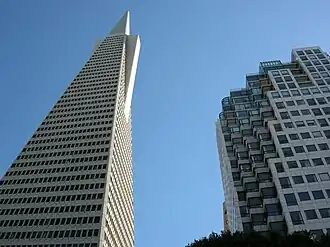 - π Transamerica Pyramid, Montgomery and Washington. San Francisco's tallest and most famous skyscraper, controversial when it opened, but now accepted. There used to be an unusual observation deck on the ground floor with 4 big TV monitors, showing live views of the city transmitted from cameras at the top of the building. They now have a happy worker at the bottom that tells you anything and everything you want to know about San Francisco and has some great stories. Then he tells you that they no longer have the 4 big TVs and are building a restaurant where you can view the city from inside.