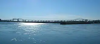 The twin cities of Sault Ste Marie (Ontario) and Sault Ste Marie (Michigan) straddle the international border between Canada and the United States of America; they are connected by a bridge across the St. Mary's River.