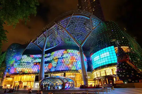 - π ION Orchard, 2 Orchard Turn (integrated with Orchard MRT). Covered in pulsating neon lights at night, this is Orchard's flashiest mall in more ways than one, extending four floors both above and under ground. The first few floors are dominated by high-street flagships for Louis Vuitton and co, but the interior and basement have plenty of more affordable options including Japanese retailers Uniqlo and Muji. The fourth floor has the ION Art gallery, while the basement 4 Food Opera food court, while a bit pricey by Singapore standards, is enormous and very popular. Located on levels 55 and 56, at 218 metres, ION Sky offers a 360-degree view from the highest point on Orchard Road.