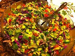 - Kachumber – this classic, everyday salad from Northern India contains the essential trio of chopped up cucumber, onions and tomatoes seasoned with salt, black pepper, cumin powder, red chilli powder. Green chillis and herbs like coriander and mint may be added. The dressing is either lemon or lime juice with no sugar or oil added. A similar salad from Afghanistan called Salata or Afghan salad usually has the same triad of vegetables with the addition of carrots and may contain other herbs such as parsley and dill.