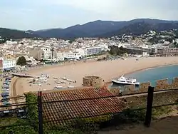 Tossa de Mar is a town of 5,600 people (2018) in the Costa Brava region of Catalonia in Northeastern Spain. Its old town is the only example of a fortified medieval town still standing on the Catalan coast.