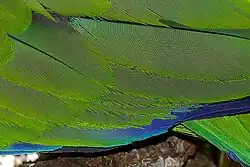 Some photos have an effect called a moiré pattern, as shown in the photo of parrot feathers to the right. Moiré can appear for any subject with repeating elements: fabrics (especially densely textured ones like tweed), cornfields, brick walls, ... It is caused by an interaction between the pattern in the subject and the pattern in the sensor.