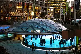Ice skating at Robson Square during the winterπRobson Square,800 Block, Robson St(Robson & Howe St).Both an office building and public space designed by Vancouver architect Arthur Erikson, it houses the Provincial Courts and a satellite UBC campus. The building, which was built to represent a skyscraper on its side, is noted for its use of water and greenery and is mostly underground. The public space features a skating rink underneath Robson Street, which is the only outdoor rink in Vancouver.Skating is available during winter and is free, skate rentals are $3.