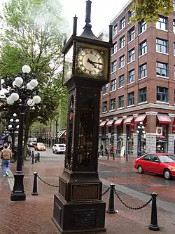 Gastown's steam clockπGastown.The oldest part of downtown. You will find cobble-paved boulevards and over-priced tourist traps selling every imaginable thing you can print "Vancouver" on. Popular with tourists are the Gastown Steam Clock, promoted as the only active steam clock in the world but in fact an electric clock that pumps steam, rather an underwhelming experience. The area is notorious for aggressive beggars-drug addicts who are quite unsettling.