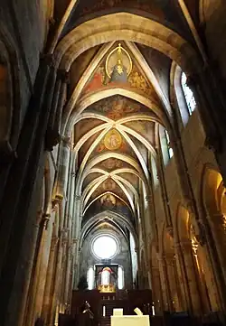 - 🌍 St. Michael's Cathedral (A veszprémi érsekség főszékesegyháza, Szent Mihály-székesegyház), Vár utca 27 (North end of Castle Hill), ☏ +36 88 328 038. May-Oct: 10:00-18:00. Masses: Basilica M-Sa 19:00, Su 09:00, 10:30, 19:00. Franciscan daily 07:00, Chapel of St. Anne M-F (during school time) 07:15, Su 10:00; Charles Church M-F 18:00, Sa 18:00, Su 8:00, 18:00, Rosary every day 17:30 (open half hour before mass). The principal cathedral of the Archdiocese of Veszprém. Founded 10th century (Romanesque) origin, Gothic crypt (end of 14th century). The external facade showin medieval details. Today's form of neo-Romanesque, rebuilt in 1907-1910, by architect Sándor Aigner. The church nave with flat paneled ceiling is covered.The column heads are designed model of the Árpád-era (10th-13th centuries) carvings, during the renovation in 1907-1910. Both side naves have two-altars. North side nave have (at the main entrance to the left) the Assumption and the St George's altars. The south nave (the main entrance to the right) have the St. Anne's and the St. Emeric altars. The church wall paintings made by Szirmay Anthony. The wall paintings depict, among other things, Saints of the Árpád dynasty, Great St. Gregory, St. John of Nepomuk and St. Augustine of Hippo, and the four evangelists. The glass windows St. Stephen, St. Margaret, Happy Ilona, Queen Gizella, St. Joseph and St. Gellert shown. There is a special relic: the Queen Gizella right forearm bones- In the main hall of the Gothic crypt placed the headstones of Bánáss Laszlo and Peter Beriszló bishops of Veszprém. A small room opening from here where Bishop Padányi Biró Martin in 1762 Baroque tomb is housed. Donation.