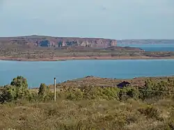 - 🌍 Picún Leufú. About 50 km south-west of El Chocón, a slightly larger (3500 inhabitants) but still quiet town in an oasis near the Ramos Mexia lake. There are several nice lake beaches at 10-15 km of the town reachable via regular dirt road (usable by normal cars, but drive slowly), but only one (the Club de Pesca) has infrastructure with toilets, shadow and a campground for a small fee. The town is pleasant and modern, it has several restaurants and shops and a small gas station. It's not touristy at all, but has several small hotels and apartment complexes, mostly for travellers on the way to Bariloche.