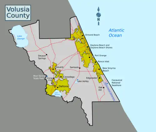 Volusia County, Florida is bordered on the west by the historic St. Johns River, and by the Atlantic Ocean to the east, and therefore is found within a fairly compact area. But as a county with a substantial population, it's substantially varied from one city to another, and could almost be seen as a miniature Florida β urban areas, palm trees, beaches, golf courses, motorsports, and forested wilderness are all found within a few miles of each other.