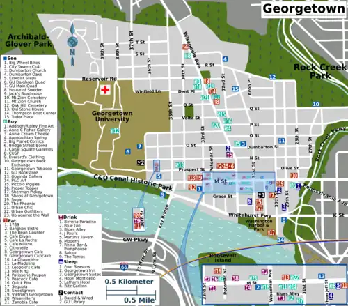 - 🌍 Georgetown Neighborhood Library, 3260 R St NW, ☏ +1 202 727-0232, georgetownlibrary@dc.gov. M-Tu 10AM-6PM, W 10AM-8PM, Th noon-8PM, F Sa 10AM-6PM, Su 1-5PM. In a beautiful old building perched atop Book Hill Park, with views over the neighborhood and across the river to Arlington.