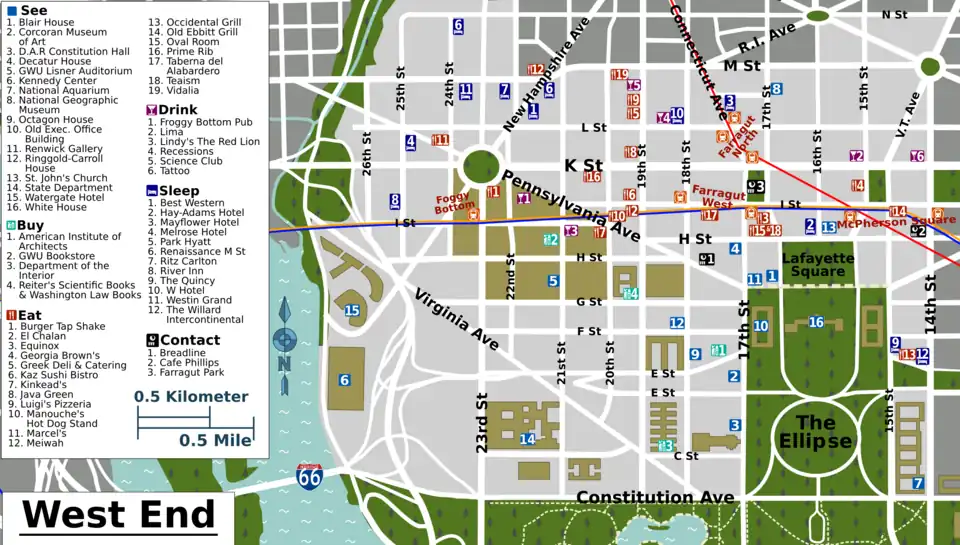 Metro's Blue, Orange, and Silver Lines run through the West End along I St. Foggy Bottom in the west is the most convenient to the Kennedy Center and to George Washington University; it is also the closest station to the eastern part of Georgetown. The walk from Foggy Bottom to the Mall is a little far, but it is the closest metro station in D.C. to West Potomac Park. Farragut West and McPherson Square are mainly for the business district, but they are also close to Lafayette Park. The latter is also just a couple blocks from the White House Visitor Center.