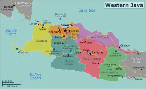 Western Java is the western third of the island of Java, Indonesia. It covers from west to east the province of Banten, the Jakarta Special Capital Region (DKI Jakarta), and the province of West Java (Jawa Barat). Western Java is one of the most densely populated regions on earth, but still there are extensive natural areas of impassable rainforest, as well as many active volcanoes and secluded beaches.