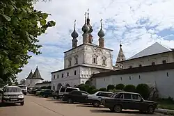 - 🌍 Monastery of Archangel Michael (Михаило-Архангельский монастырь), ул. 1 мая/Советская пл. The monastery dates back to early 13th century, but its present buildings are much later (16th–18th century). The complex is surrounded by a stone wall with towers. The wall was built in the 16th century, and then rebuilt in 18th century. The towers still look fortress-like and quite impressive, while the wall is rather low and does not have any defensive function. Behind the wall, there are several churches in Russian style: the cathedral of Archangel Michael (late 18th century), the church of Orans (1625), the church of John the Evangelist (over the gate, 17th century), and the wooden church of St. George (17th century, this church was moved from a neighboring village). Additionally, there are a hip-roof bell tower and a refectory building from the 17th century. The cathedral of Archangel Michael belongs to the church, while other buildings are used by the museum.